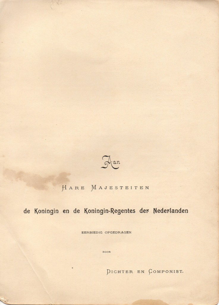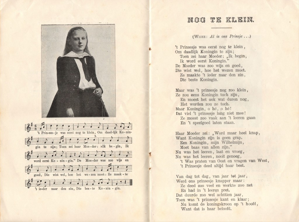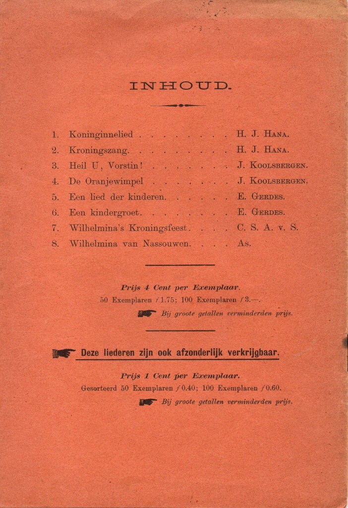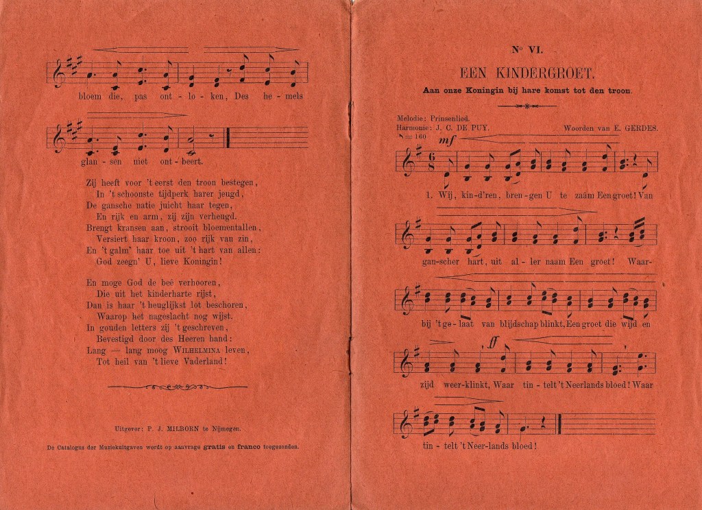 In Nijmegen kwam iets heel vergelijkbaars uit, maar daar luidde de titel Kroningsliederen. Voor de omslag is dezelfde statiefoto gebruikt en er is weer extra werk gemaakt van de omlijsting. In dit geval is het hele boekje op oranje papier gedrukt (zie de eerste foto). De acht liedjes zijn speciaal voor de gelegenheid geschreven en lijken elkaar te willen overtreffen in pompeusheid en uitroeptekens. Ze waren ook los verkrijgbaar – voor een luttele cent per stuk. Dit is het eerste couplet van het eerste lied.