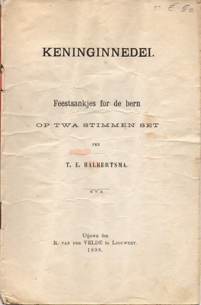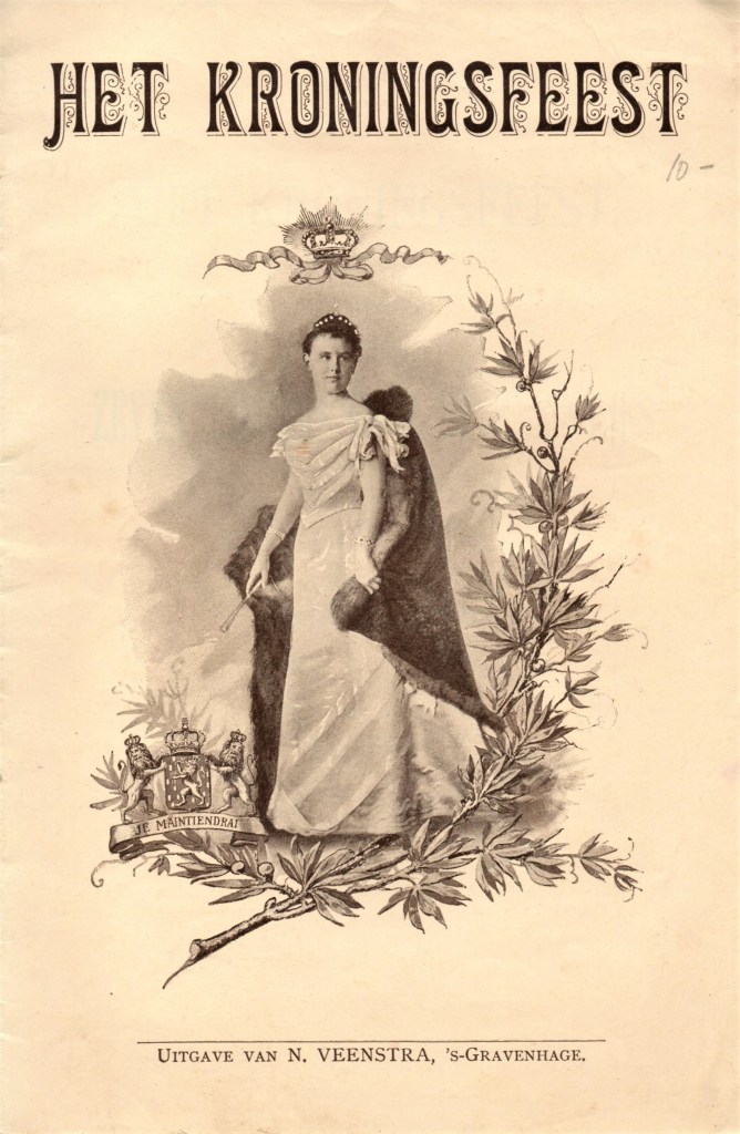 Dit gehavende bundeltje komt uit Leeuwarden. Ik ben het Fries helaas niet machtig, maar dat Keninginnedei ‘Koninginnedag’ betekent is niet moeilijk te raden. De keuze voor een oranje omslag is vast geen toeval. De foto lijkt een statieportret, waarbij de simpele leunstoel wel de troon zal moeten voorstellen die Wilhelmina nu bestegen heeft. In haar rechterhand hangt losjes de koninklijke scepter en met haar linkerhand probeert ze de koningsmantel op zijn plaats te houden. Voor de omlijsting lijkt de zetter al zijn sierstukken uit de letterkast gehaald te hebben.