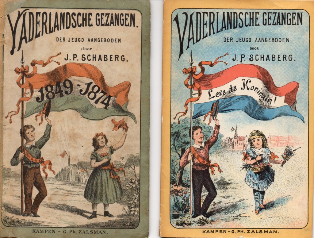 J.P. Schaberg, schoolhoofd in Den Haag, was dol op herdenkingen. Over elk belangrijk historisch jubileum (50 jaar Slag bij Waterloo, 300 jaar Inname van Den Briel, 750 jaar Kerkhervorming) schreef hij een kinderboek. Ter gelegenheid van het 25-jarig koningschap van Willem III in 1874 publiceerde hij een bundeltje vaderlandse gezangen. Die gingen natuurlijk over de grootse daden en deugden van de koning, maar ook weer over het Ontzet van Leiden, de Victorie van Alkmaar en dergelijke. In het voorwoord schrijft hij: “De band, door God om Nederland en Oranje gelegd, moet gekend, erkend, gevoeld en bevestigd worden. Daartoe zijn vaderlandsche gezangen uitnemende hulpmiddelen.” De pathetische liederen zijn er dan ook naar. Je kunt je niet voorstellen dat enig schoolkind ze met plezier gezongen heeft, al beweert Schaberg van wel. Hoe dan ook, in 1898, bij de kroning van Wilhelmina, bracht hij het bundeltje opnieuw uit. Door in één lied vijf woorden te veranderen en het titelplaatje een beetje aan te passen was het hele liedboekje meteen weer zo goed als nieuw…