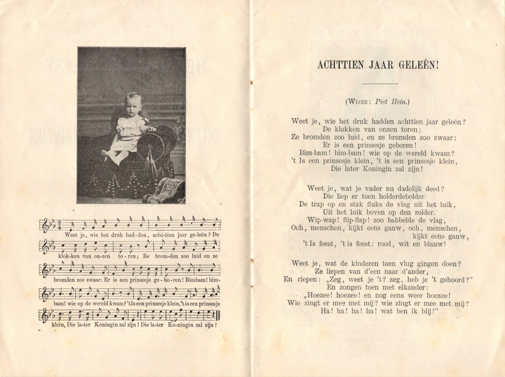 Koninginnedag 1898 zou je de eerste ‘echte’ koninginnedag kunnen noemen. Op 31 augustus 1898, haar 18e verjaardag, werd Wilhelmina tot koningin gekroond. Eigenlijk was ze dat al sinds de dood van haar vader, koning Willem III, op 23 november 1890. Maar omdat ze aanvankelijk nog te jong was om te regeren trad haar moeder, koningin Emma, op als regentes. Op Wilhelmina’s verjaardag werd al een paar jaar koninginnedag gevierd (‘prinsessedag’ zolang haar vader nog leefde), maar die van 1898 was veel specialer. Aan dat kroningsfeest en die koninginnedag danken we een paar bijzondere liedboekjes, die her en der in het land verschenen zijn.